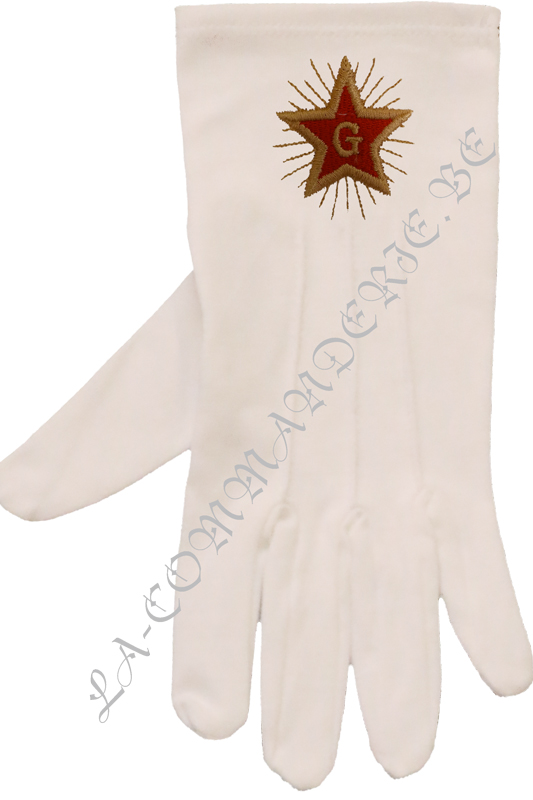 Gants brodés avec une étoile flamboyante et le G sur gants blancs. Existent en tailles S – M – L – XL et XXL. Article brodé à la machine.