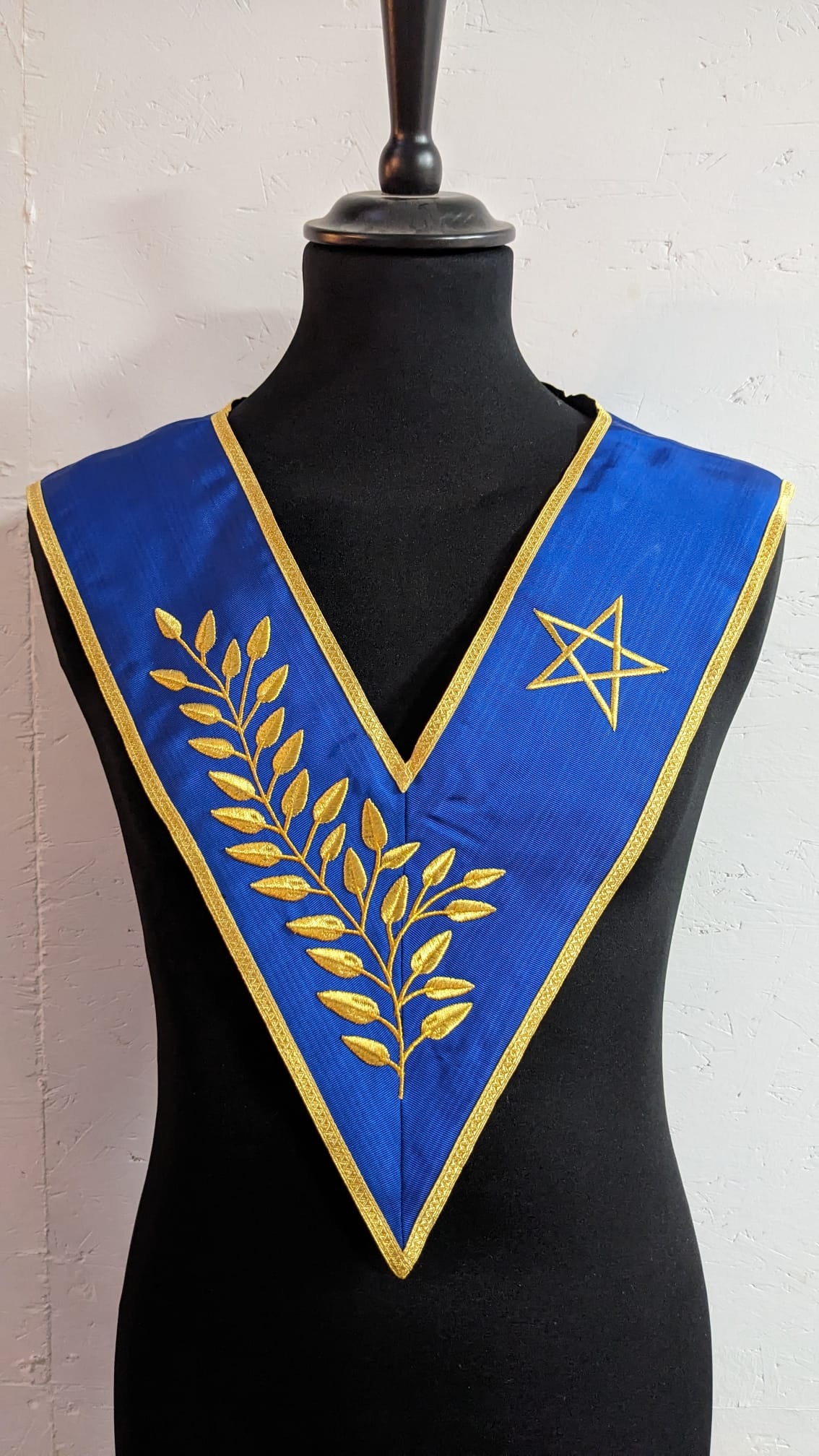 Sautoir du Trois Fois Puissant Maître, Président du 14° degré Memphis-Misraïm sur ruban bleu roy moiré, bordé or et galon doré. Doublure noire en coton.