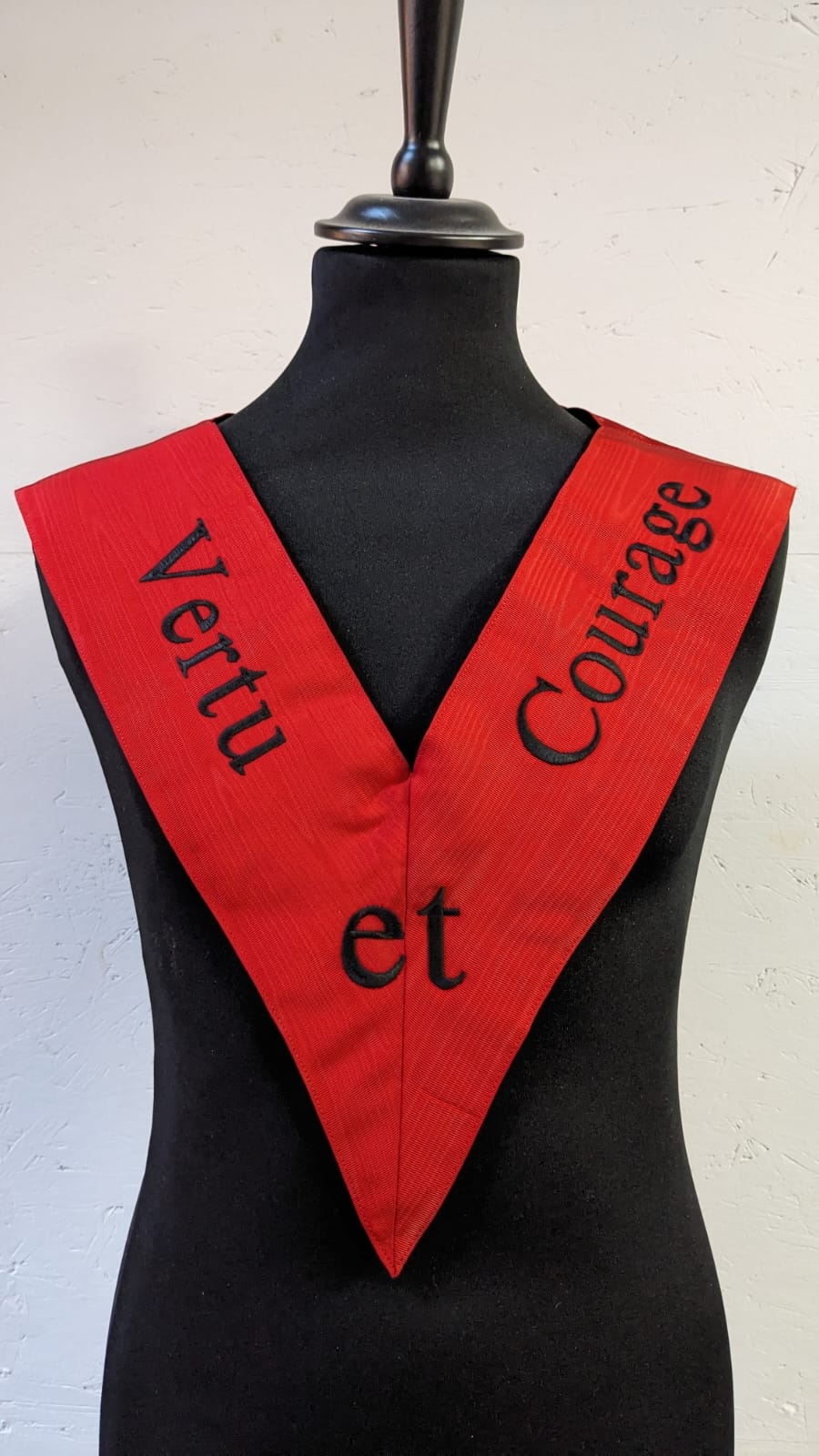 Sautoir 25e au rite écossais ancien et accepté. Ruban rouge moiré avec broderies "Vertu et Courage". Doublure en soie rouge. Article brodé à la machine, confectionné à la main.